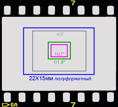 Первый рисунок. Он показывает относительные размеры матриц различных цифровиков и 35 мм фотопленочного кадра 24х36 мм