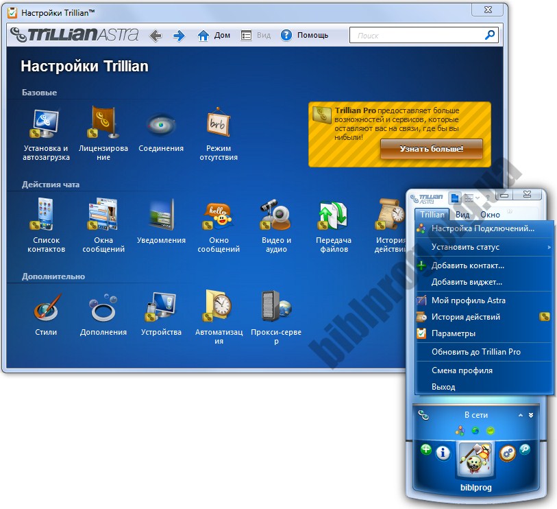 Trillian позволяет пользователю подключаться одновременно ко многим протоколам обмена сообщениям, не требуя при этом запуска нескольких программ. Все контакты находятся в одном окне и не требуют привязки к тому или иному протоколу. Среди других возможностей — настраиваемые звуковые эффекты, расшаривание ресурсов, поддержка скинов, плагинов и многое другое.