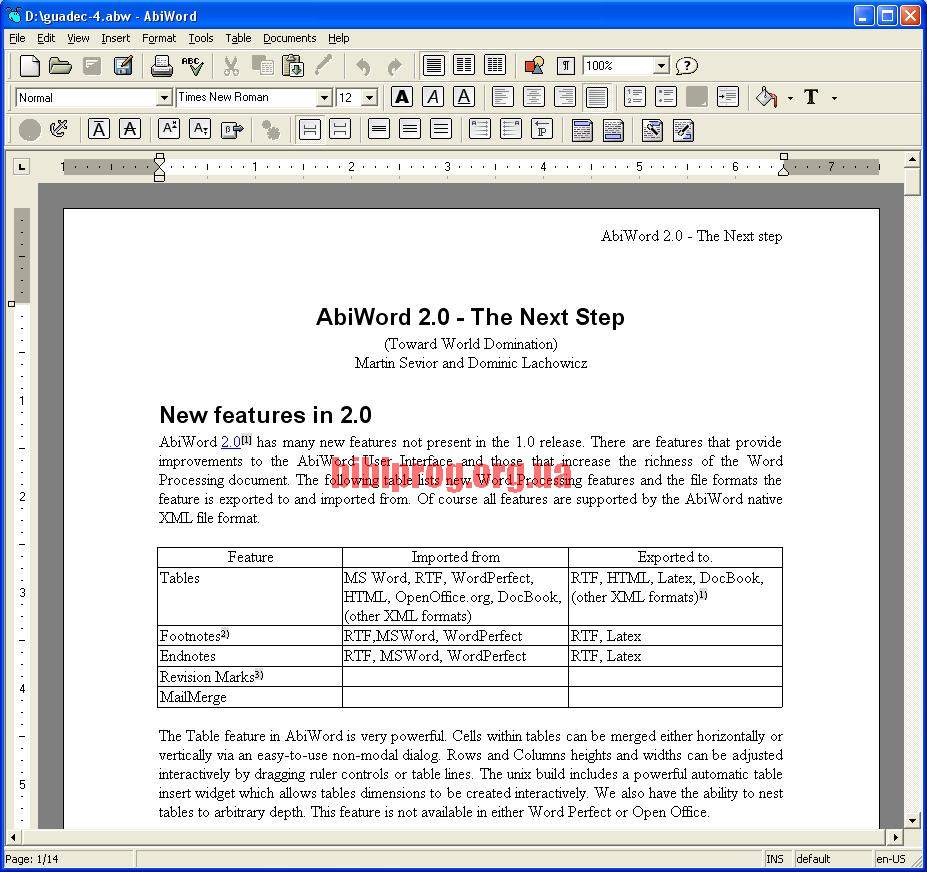 — AbiWord поддерживает все стандартные типы форматов: OpenOffice.org, Microsoft Word, WordPerfect, Rich Text Format, HTML и многие другие...