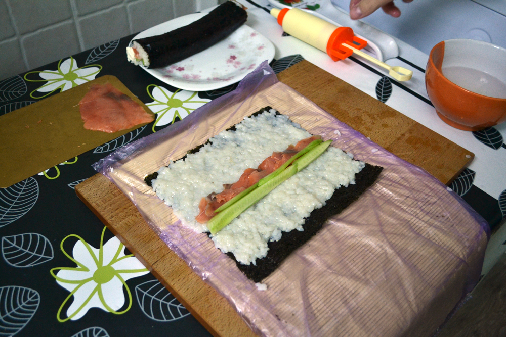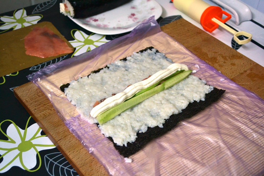 Когда будете разрезать ролл, смачивайте нож водой! Один раз разрезали, вымыли нож, второй раз разрезали - еще раз вымыли, итд! Иначе плохо режется!