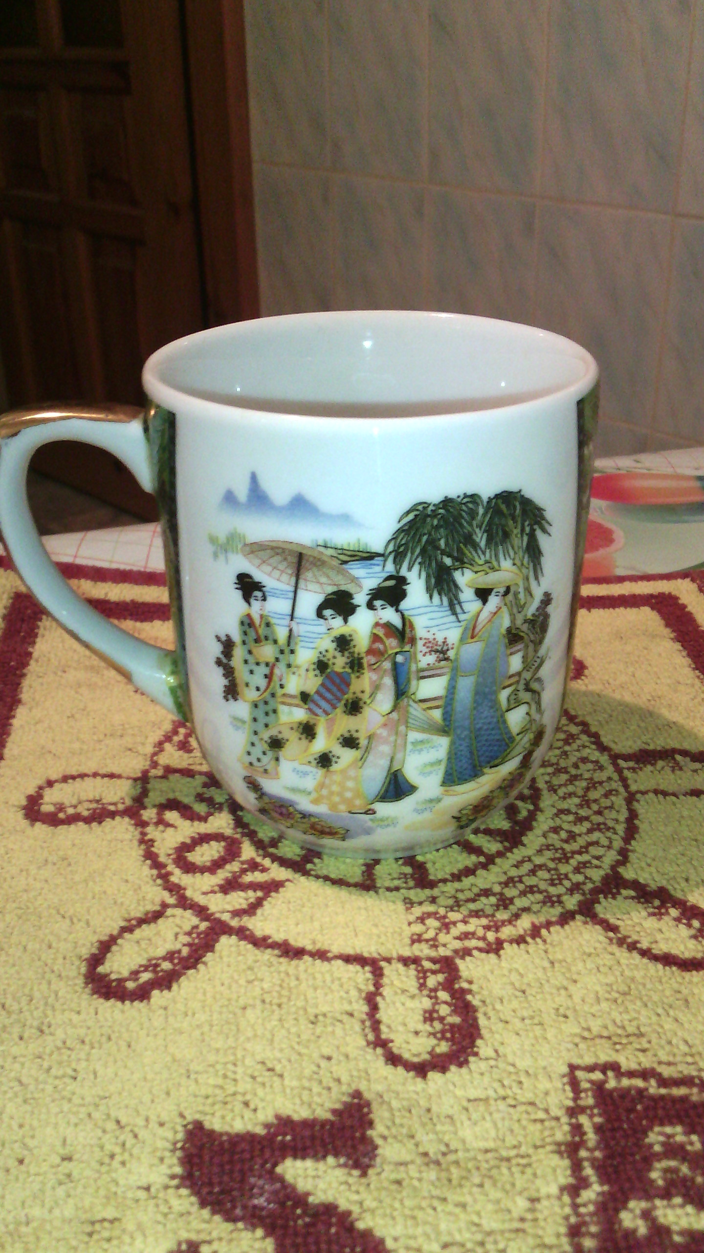 Эту кружку мне привезла тётя из острова Крит{Грецыя}.Сам я полететь не смог по состоянию здоровья...Так что эта чашка как "утешительный приз"для меня.В данный момент пью чай,но в основном только кофе с молоком