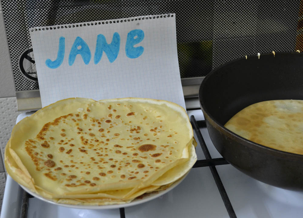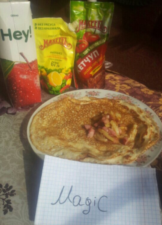 ) печет блинчики профессионально, это его каронное блюдо, всегда печет сам, а сегодня, пока он в душе был, решила попробовать первый раз в жизни испечь сама… да, этот шанс у меня появился только благодаря тому, что он был в душе