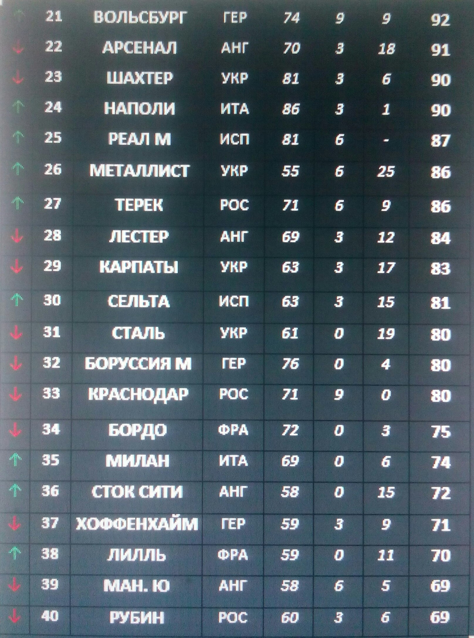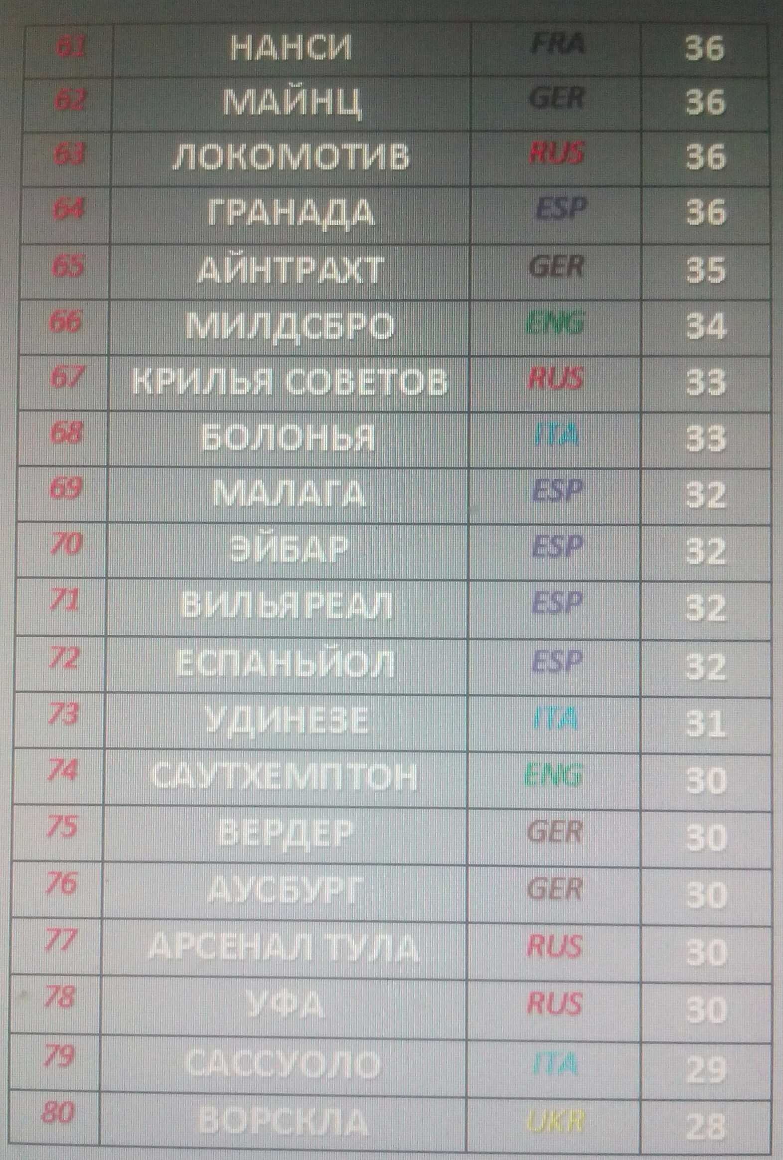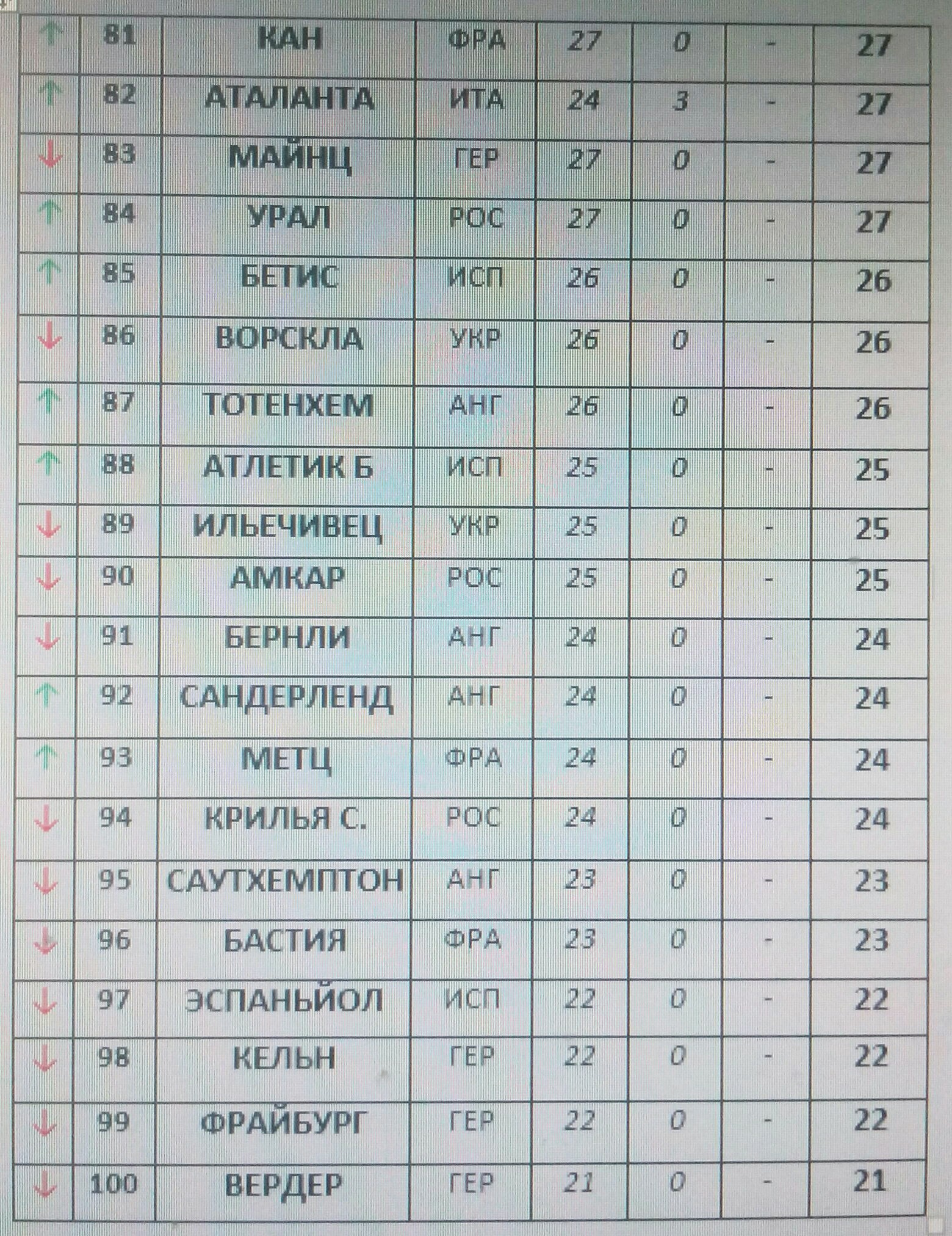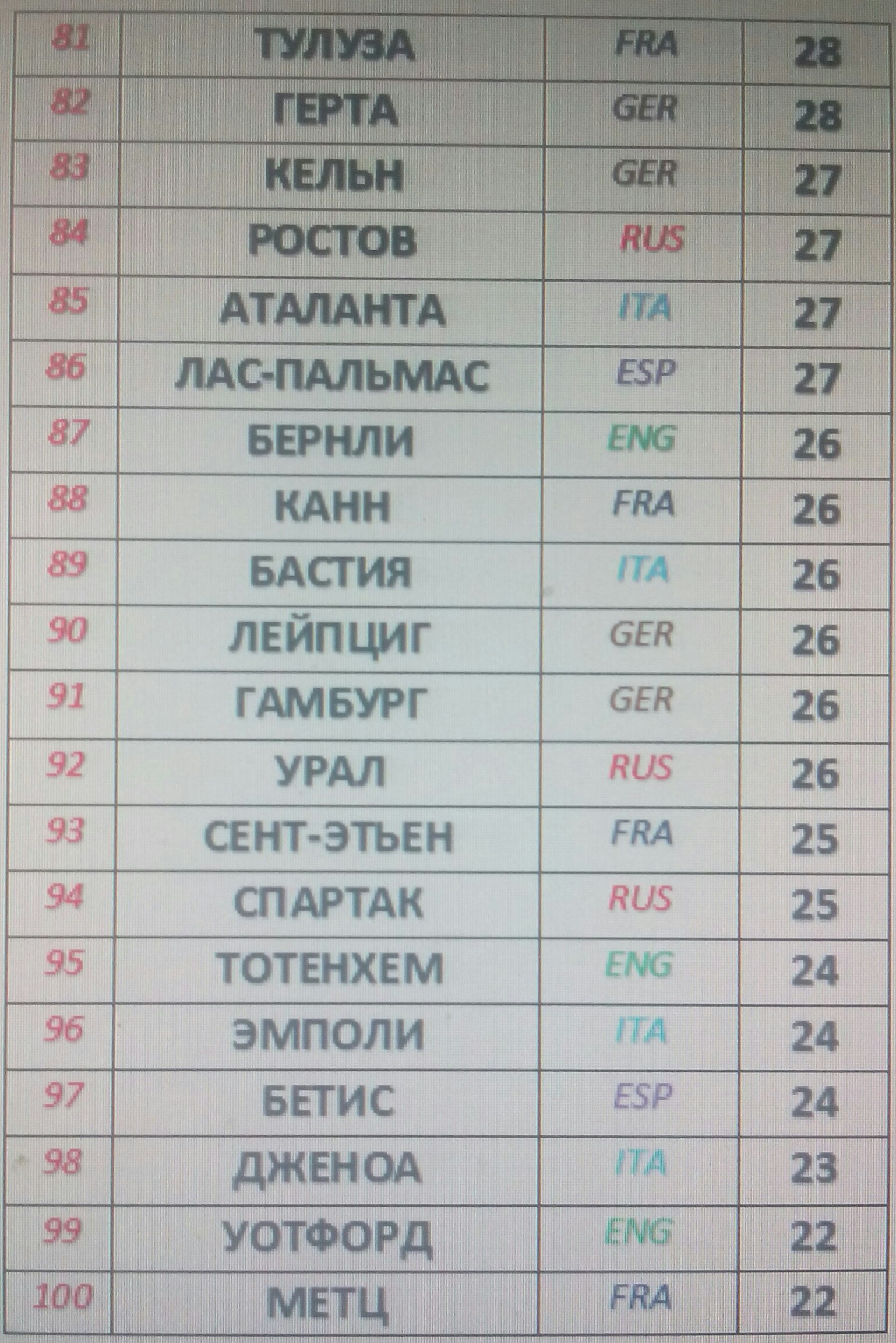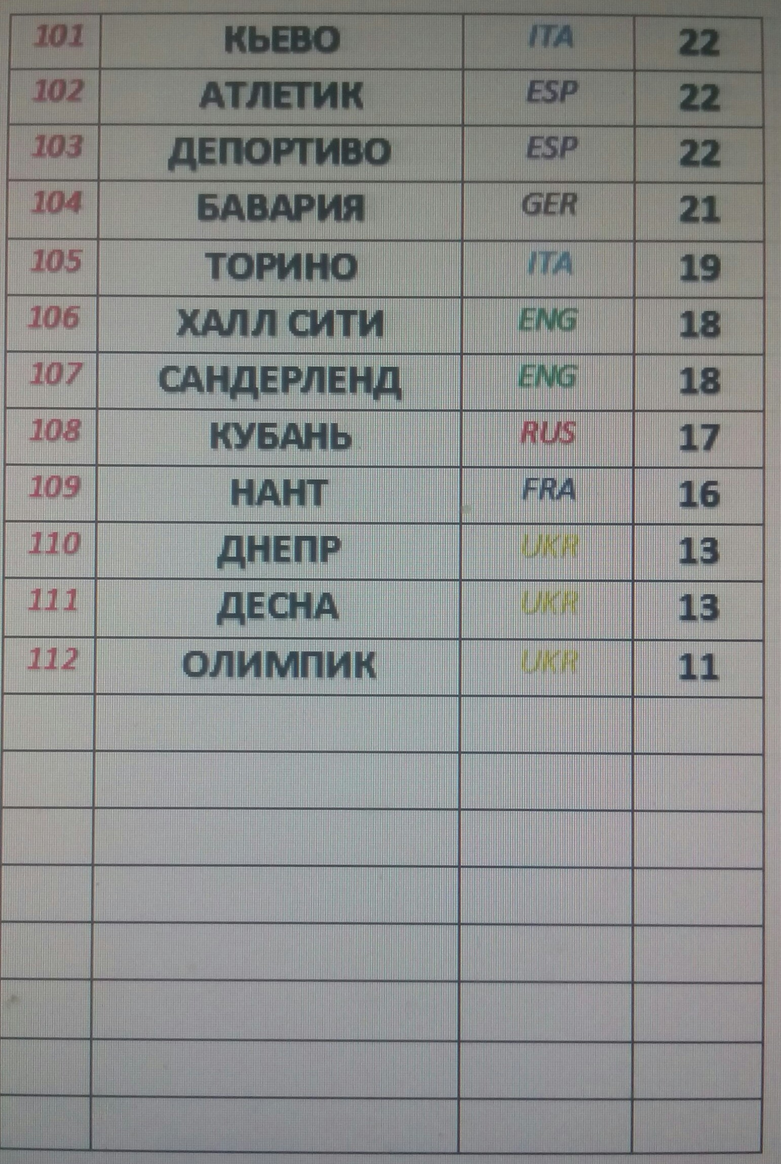 Позиция - Команда - Чемпионат - Очки(чем.-куб.-ЭК) - Рейтинг