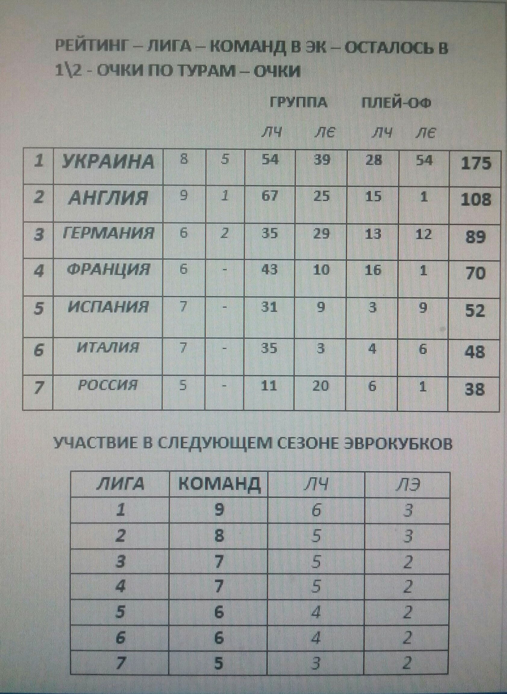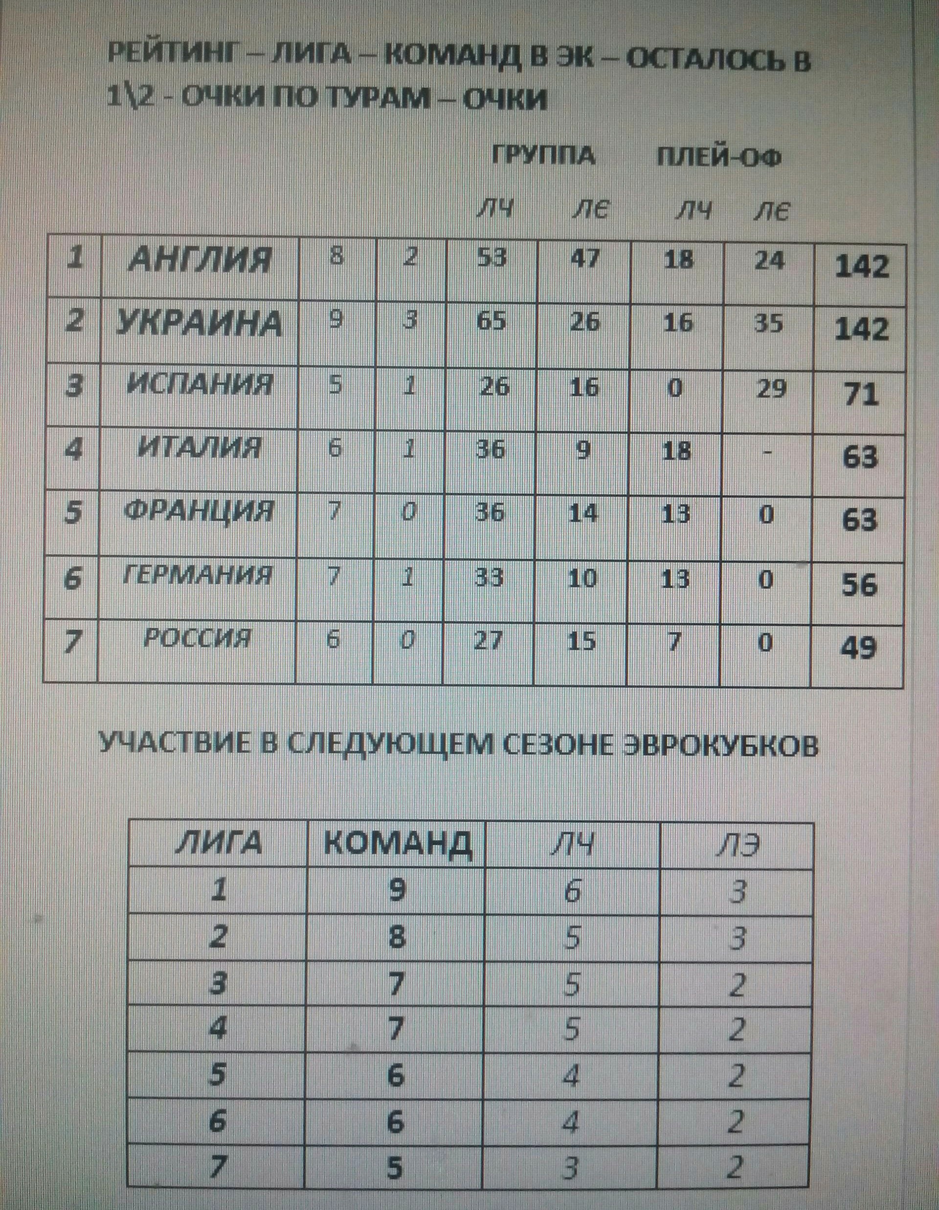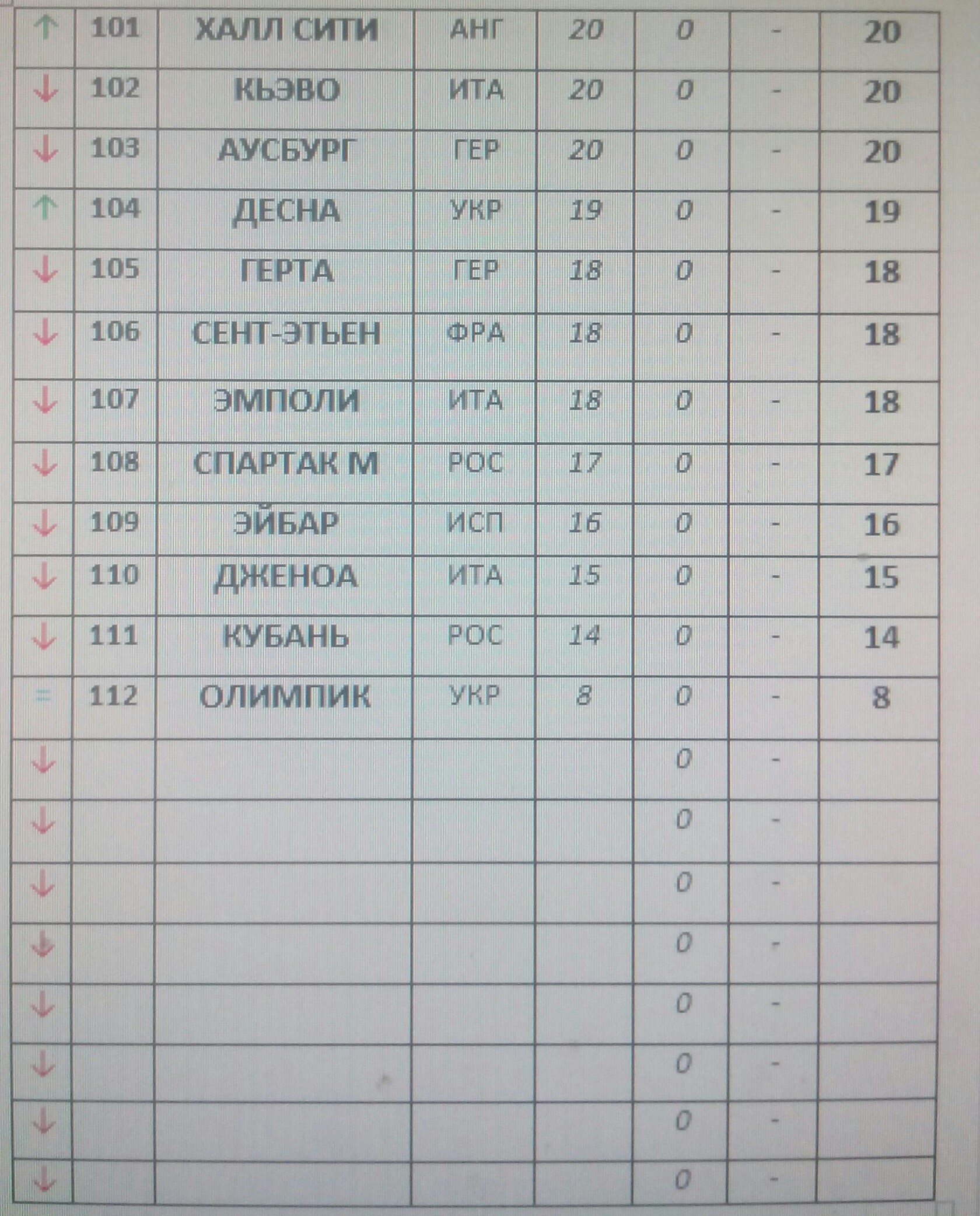 Место - Команда - Лига - Очки(Лига+Кубок) - Очки(ЭК) - Рейтинг